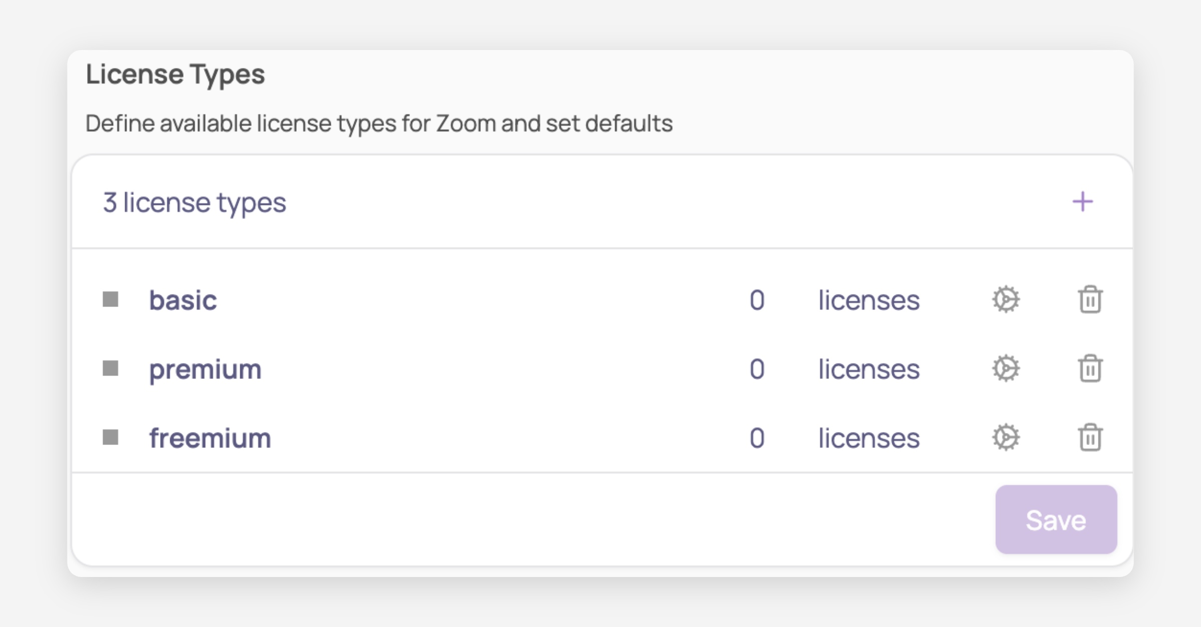 Define the available license types for the app (e.g., Basic, Premium, Enterprise) and set default options for new assignments