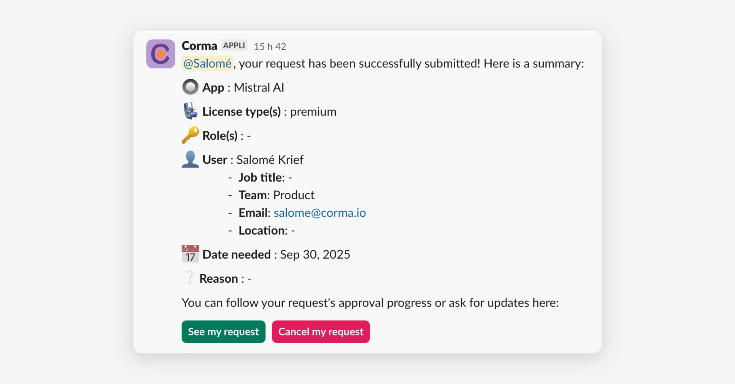 Note: Corma enables the submission of access requests on behalf of teammates, removing friction from common IT workflows.
